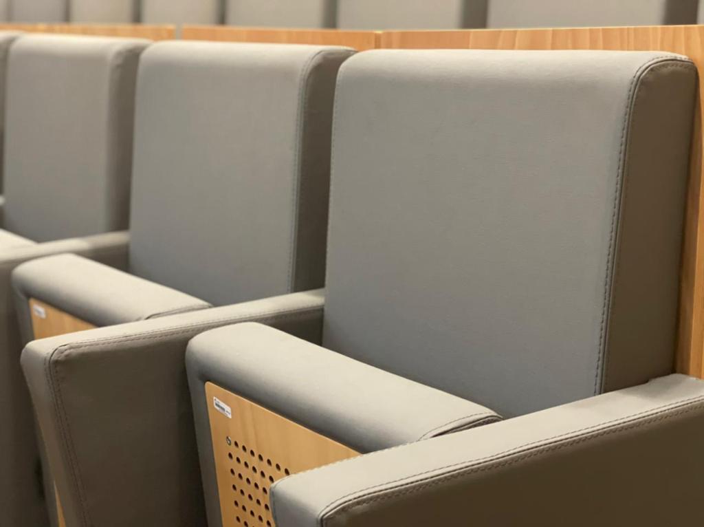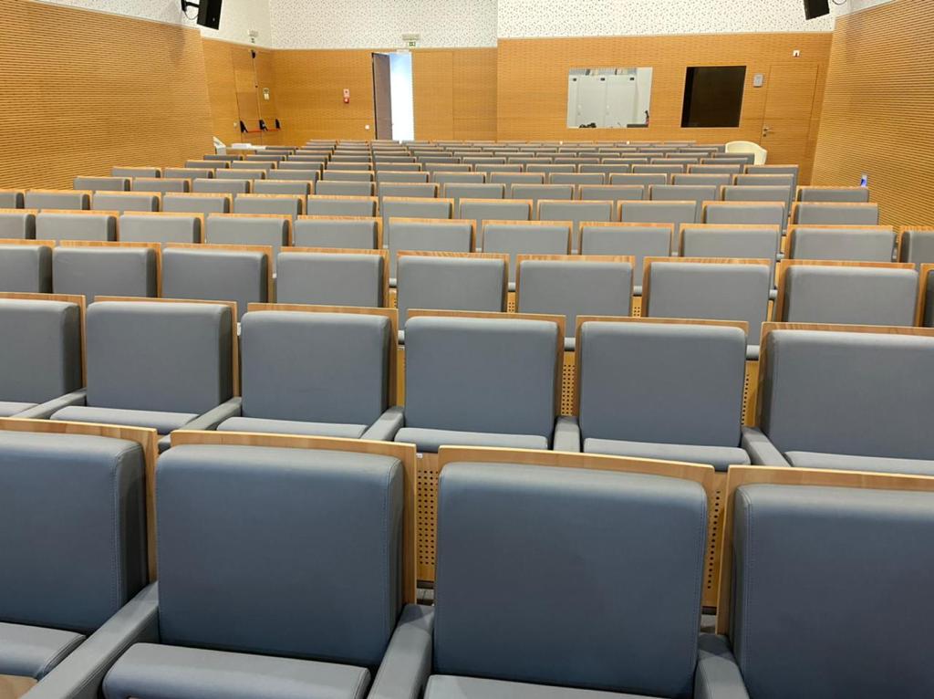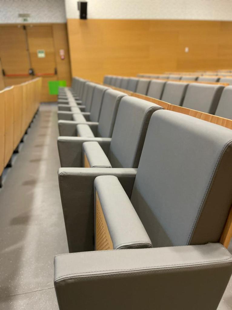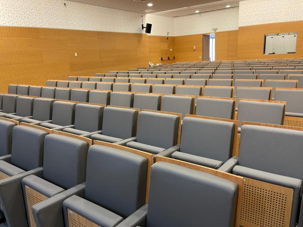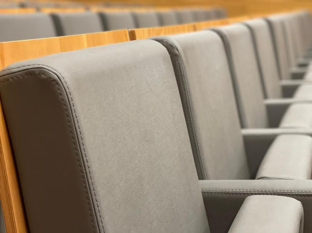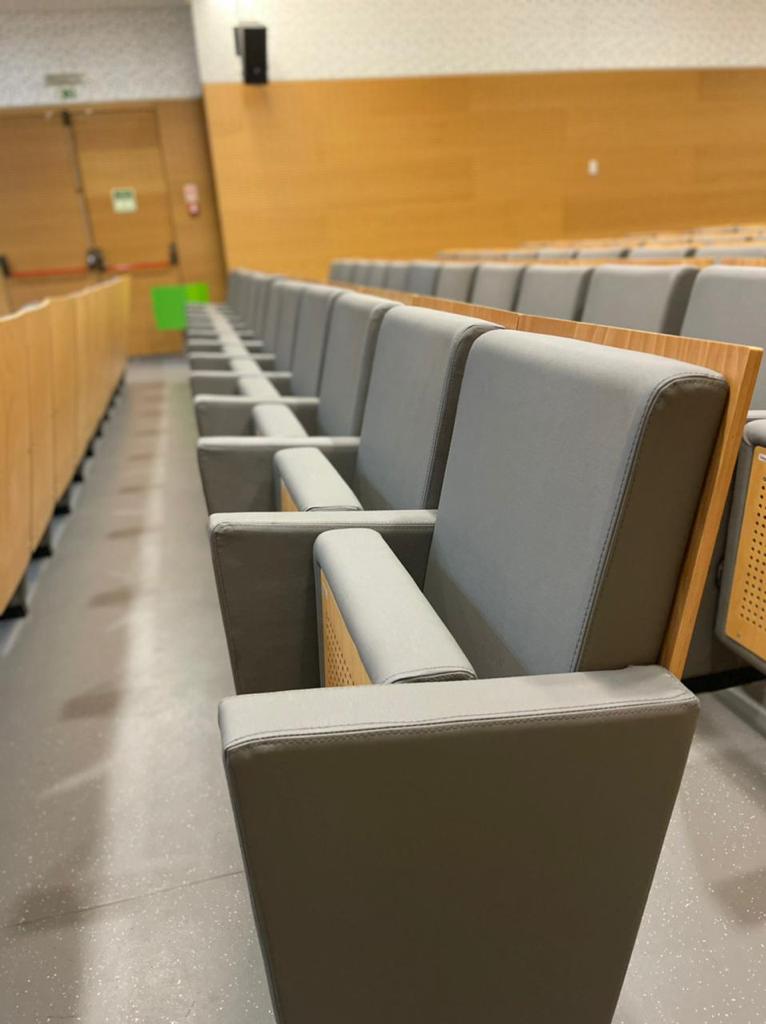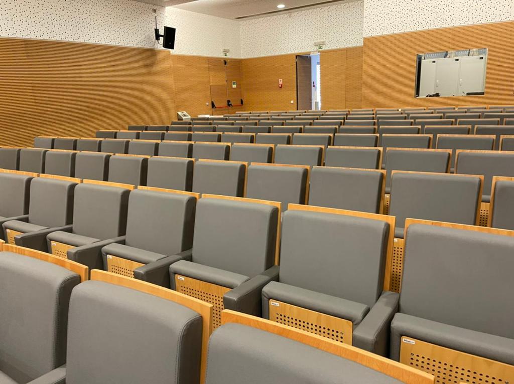 Tendo em conta que espaços públicos requerem revestimentos com alta qualidade e duráveis, o cliente escolheu o revestimento Uphostery da Vescom para fazer a remodelação dos bancos do auditório. Este revestimento está pronto para resistir aos acidentes diários tais como: resistência a abrasão, retardador de fogo, resistência à fricção, à luz solar, à urina, à pele e à tensão.