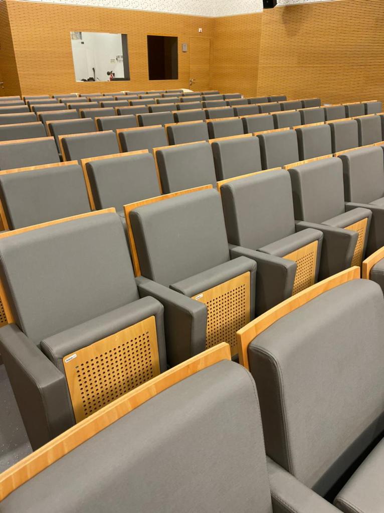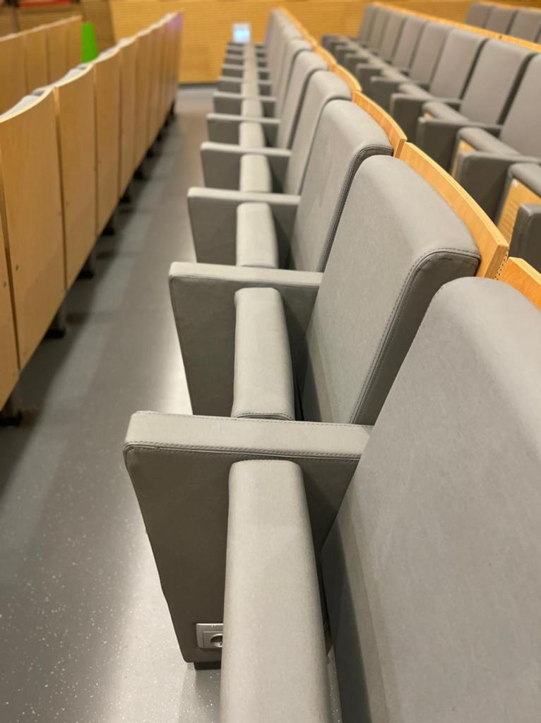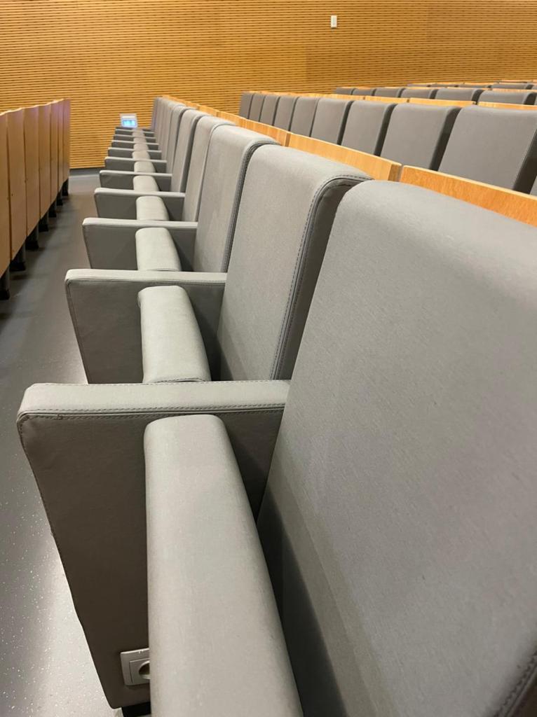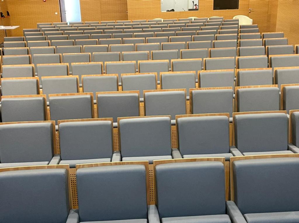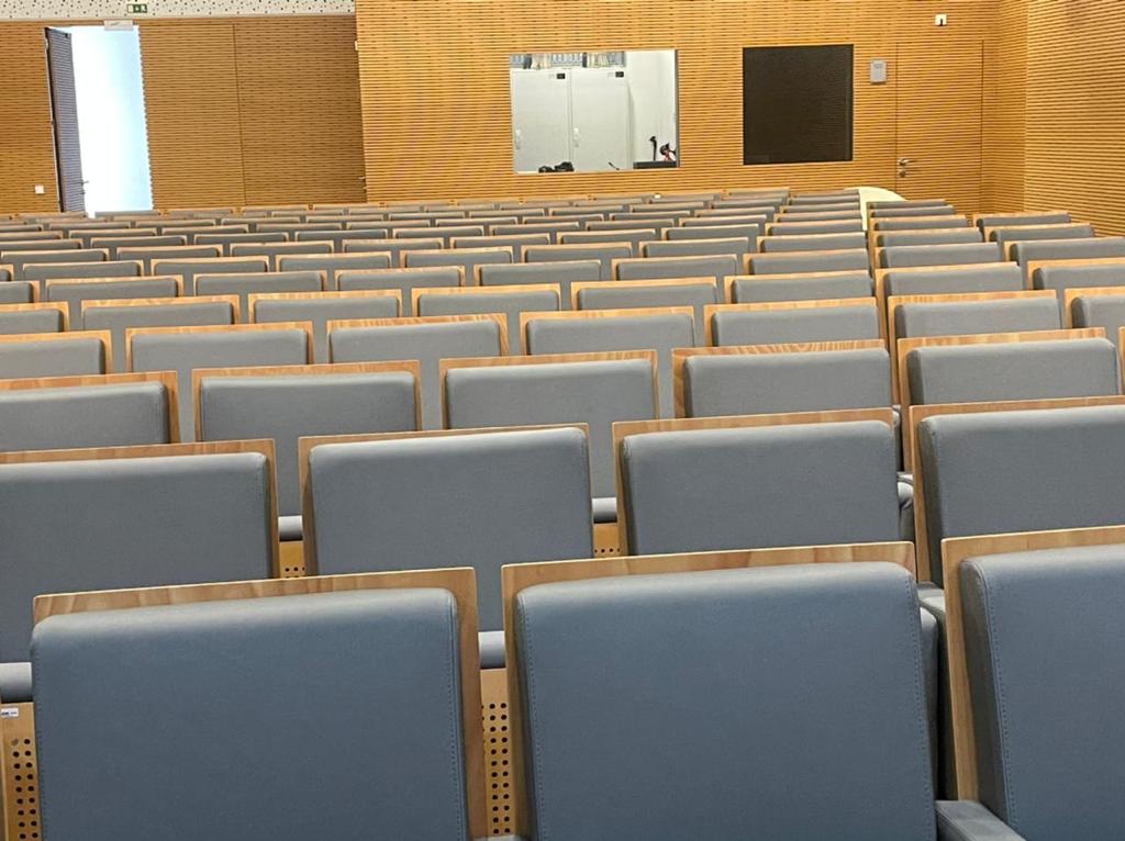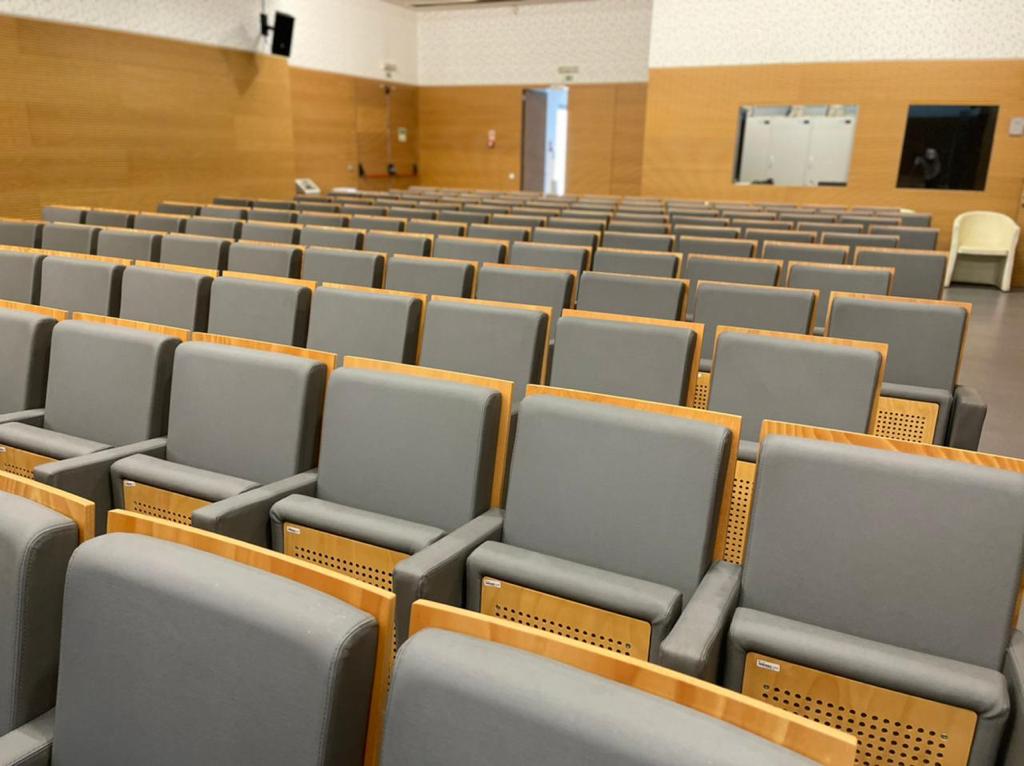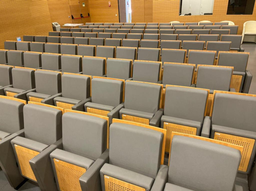 Tendo em conta que espaços públicos requerem revestimentos com alta qualidade e duráveis, o cliente escolheu o revestimento Uphostery da Vescom para fazer a remodelação dos bancos do auditório. Este revestimento está pronto para resistir aos acidentes diários tais como: resistência a abrasão, retardador de fogo, resistência à fricção, à luz solar, à urina, à pele e à tensão.