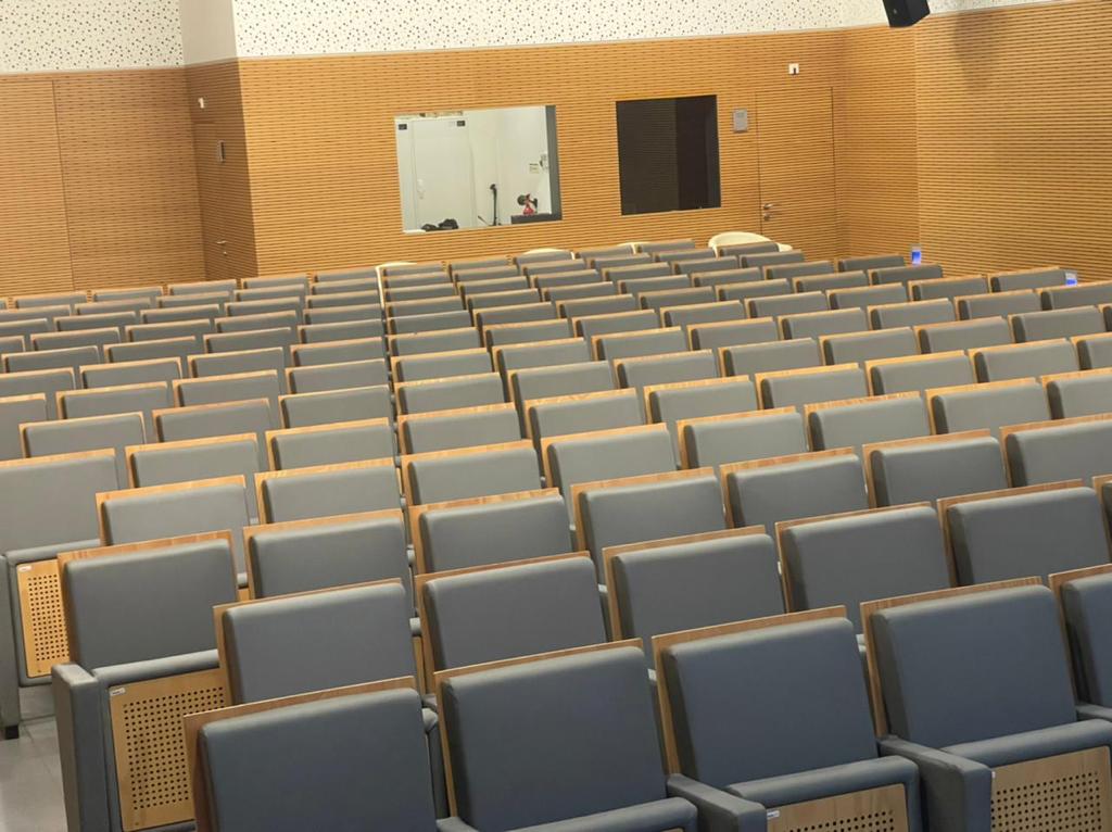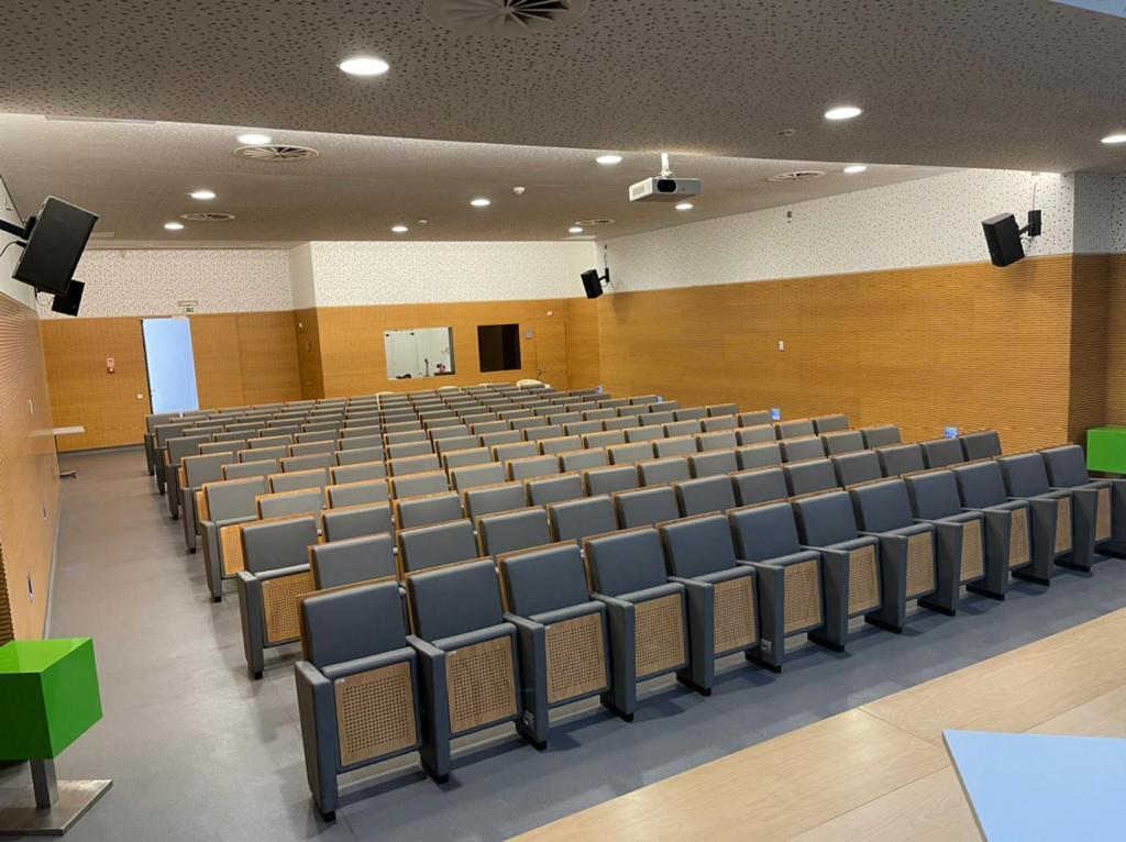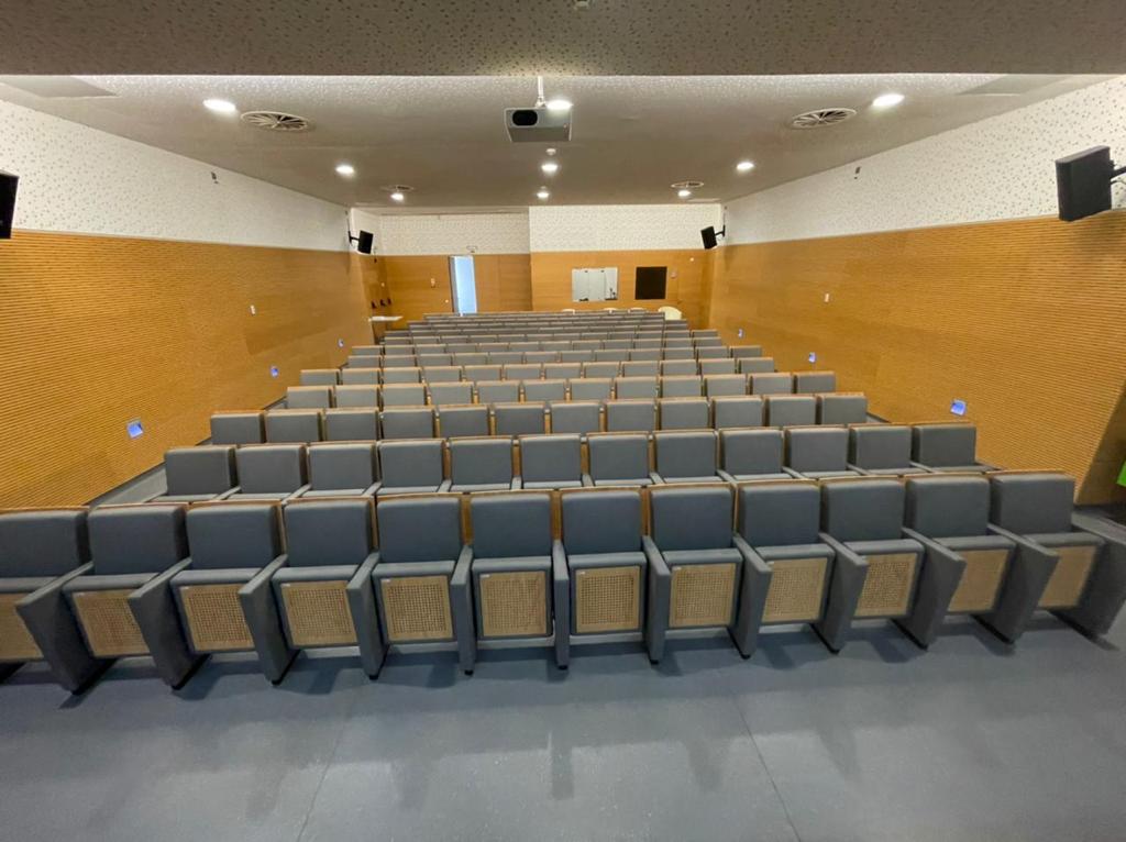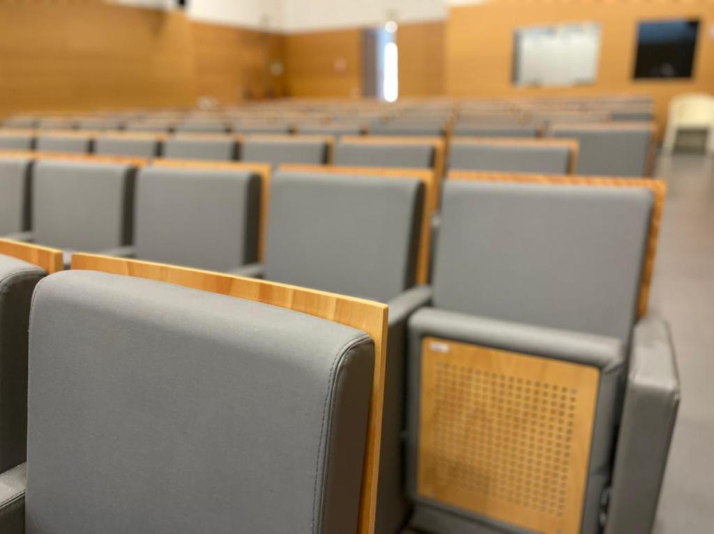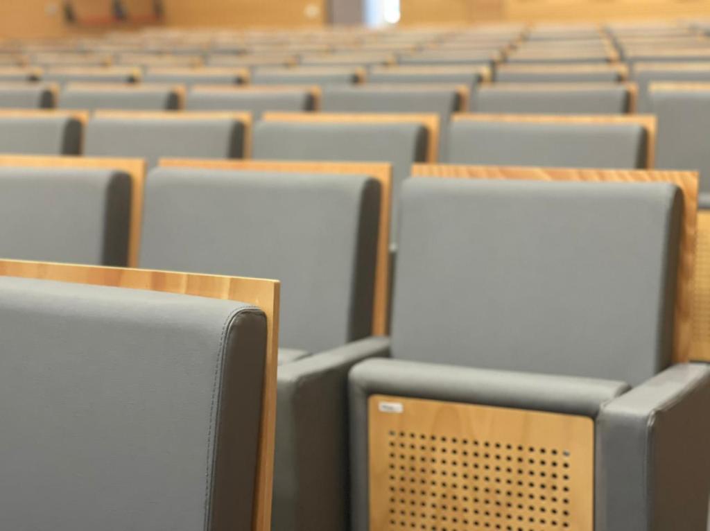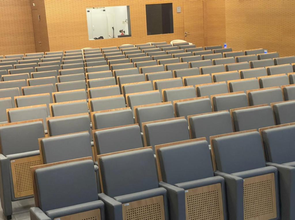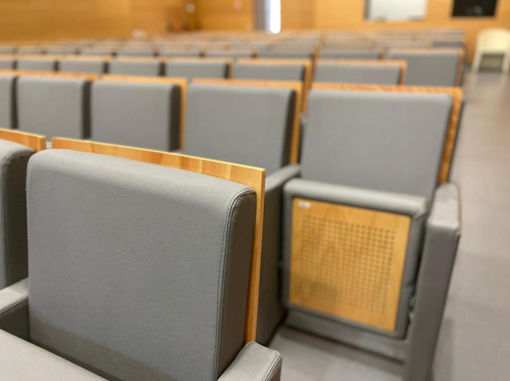 Tendo em conta que espaços públicos requerem revestimentos com alta qualidade e duráveis, o cliente escolheu o revestimento Uphostery da Vescom para fazer a remodelação dos bancos do auditório. Este revestimento está pronto para resistir aos acidentes diários tais como: resistência a abrasão, retardador de fogo, resistência à fricção, à luz solar, à urina, à pele e à tensão.